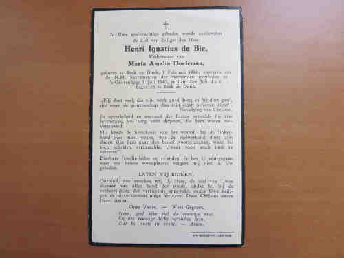 Henri Ignatius de Bie Geboortedatum 01-02-1866 Geslacht Man Vader Franciscus Kornelis de Bie Moeder Wilhelmina Swinkels
