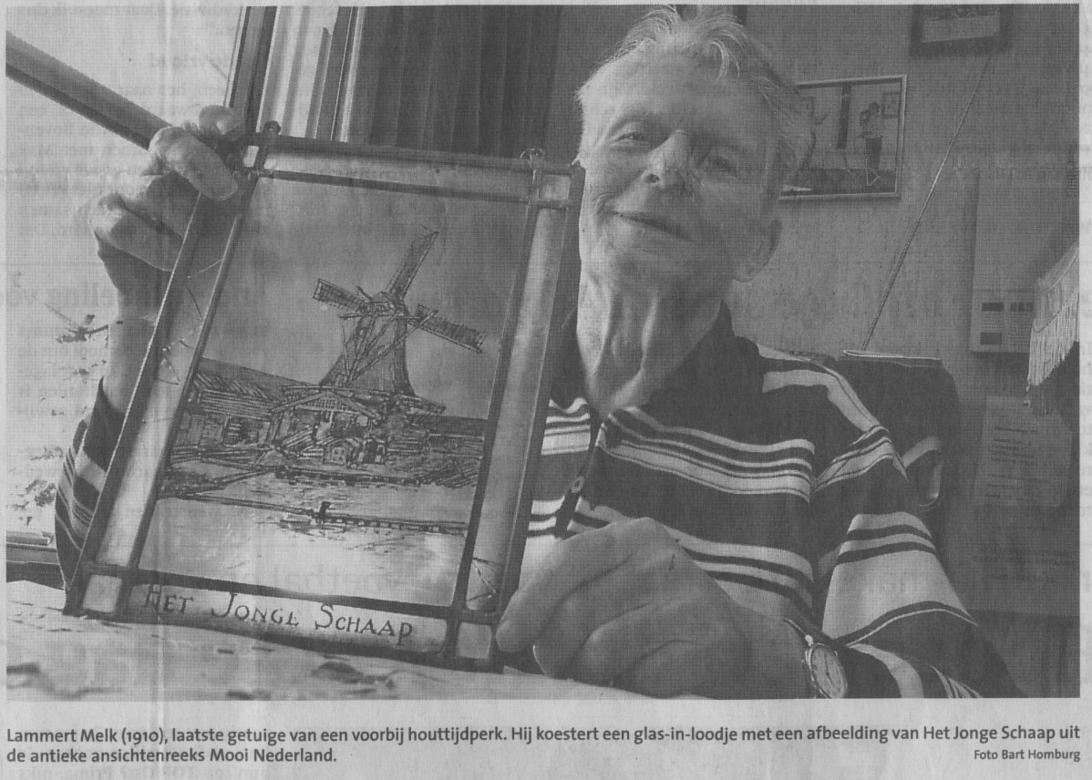 Achter het raam, in de zon, tussen voorwerpen van zelf gedraaid hout en schilderijtjes van molen Het Jonge Schaap, leunt de 94-jarige Lammert Melk achteruit. Broos maar blij. Binnenkort keert het verloren 'Skaepie' uit zijn kinderjaren weer. Al dagen zit hij zo voor zich uit de toespraak te repeteren voor vanmiddag, als hij het bouwbord op de Zaanse Schans heeft onthuld. Staand wil hij spreken, 'want dat komt beter over'. En zoals hij daar zit, maakt zijn verhaal al zo'n indruk: ,,Dat ik als jongste zoon van Kees Melk, de laatste molenaar twee๋nzestig jaar na de sloop hier mag wezen om getuige te zijn van de voorbereiding om Het Jonge Schaap opnieuw te bouwen.''.
