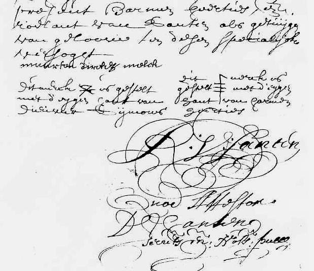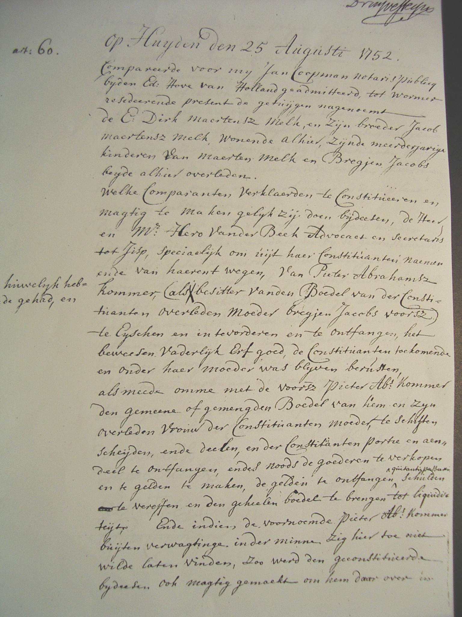 Notaris was Dick van Santen. Uit de akte blijkt dat maarten zijn naam kon schrijven. Dieuwertje tekende met een merk. Getuigen was Harmen Heertjes.